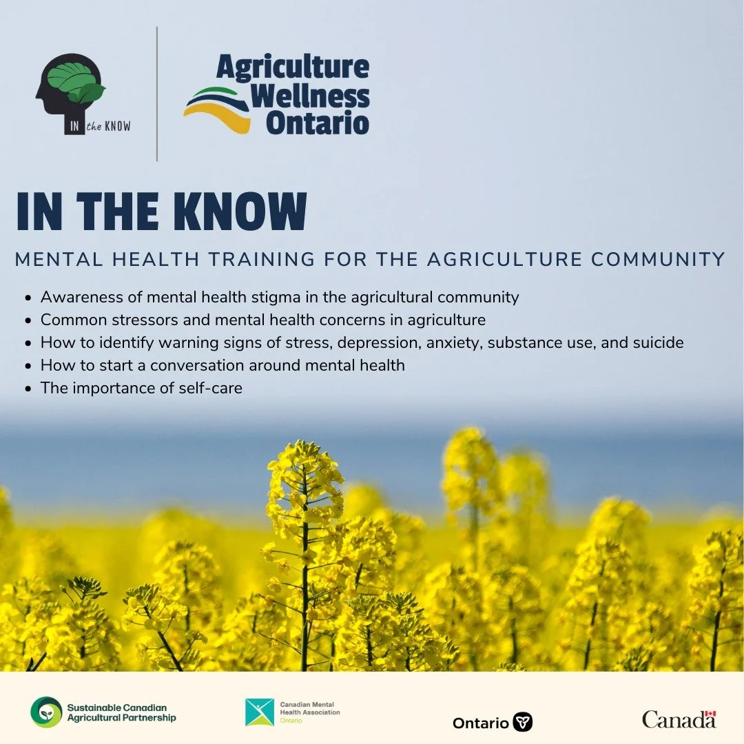 Agriculture Wellness Ontario is offering "In the Know," a free mental health literacy workshop tailored to the agricultural community to increase mental health knowledge and encourage help-seeking.