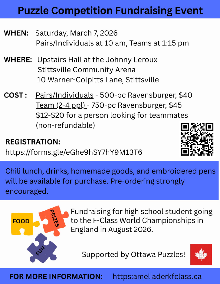 Support local athlete Amelia Derk as she prepares to represent Canada at the F-Class World Championships in England this August! Amelia is a 16-year-old shooting athlete who was recently named Ottawa’s top shooting athlete of 2025. This community event invites you to piece together a mystery puzzle with friends or family, which you get to take home afterward. There will be prizes, a chili lunch, homemade goods, and personalized pens available for purchase. All funds raised go directly toward Amelia’s competition travel costs.