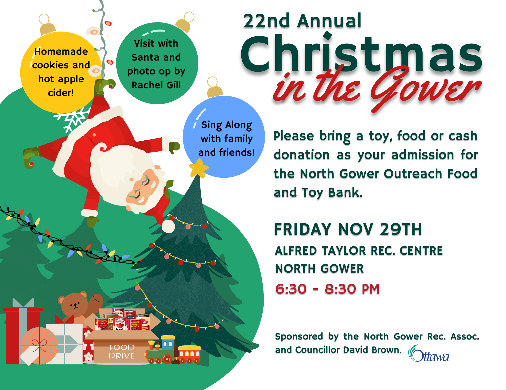 Back to All Events Christmas in the Gower Friday, November 29, 2024 6:30 p.m. 8:30 p.m. Alfred Taylor Rec. Centre North Gower (map) Google Calendar ICS
