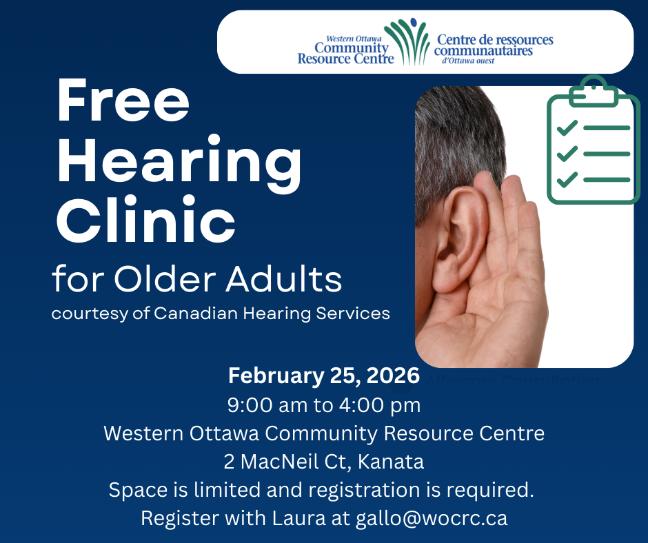 The West Ottawa Community Resource Centre is hosting a free hearing clinic for older adults (55+) this February. In partnership with Canadian Hearing Services, this on-site event offers residents a convenient way to have their hearing checked by professionals. Please note that spaces are limited, and you must have a valid health card to participate.