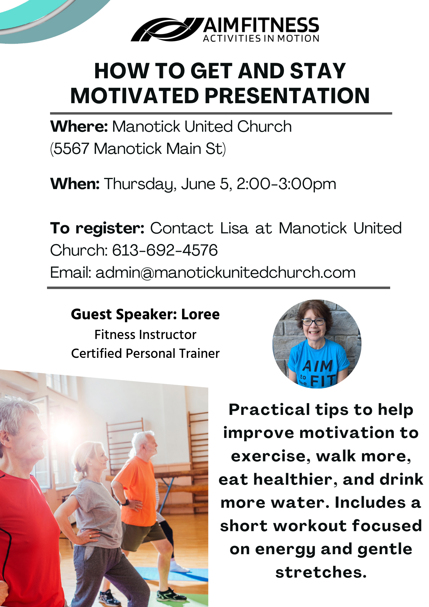 Back to All Events How to Get and Stay Motivated Presentation Thursday, June 5, 2025 2:00 p.m. 3:00 p.m. Manotick United Church 5567 Manotick Main Street Manotick, ON, K4M 1E2 Canada (map) Google Calendar ICS