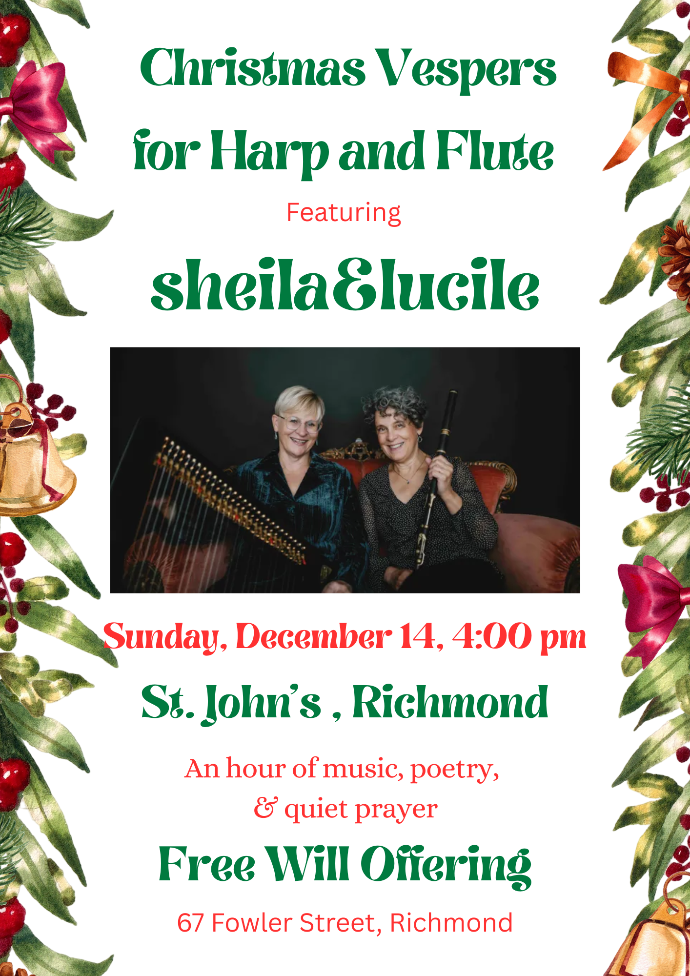 Join St. John's Anglican Church in Richmond for a special Christmas Vespers service featuring the beautiful music of Sheila & Lucile on harp and flute. This event offers a peaceful hour of music, poetry, and quiet prayer to celebrate the season.