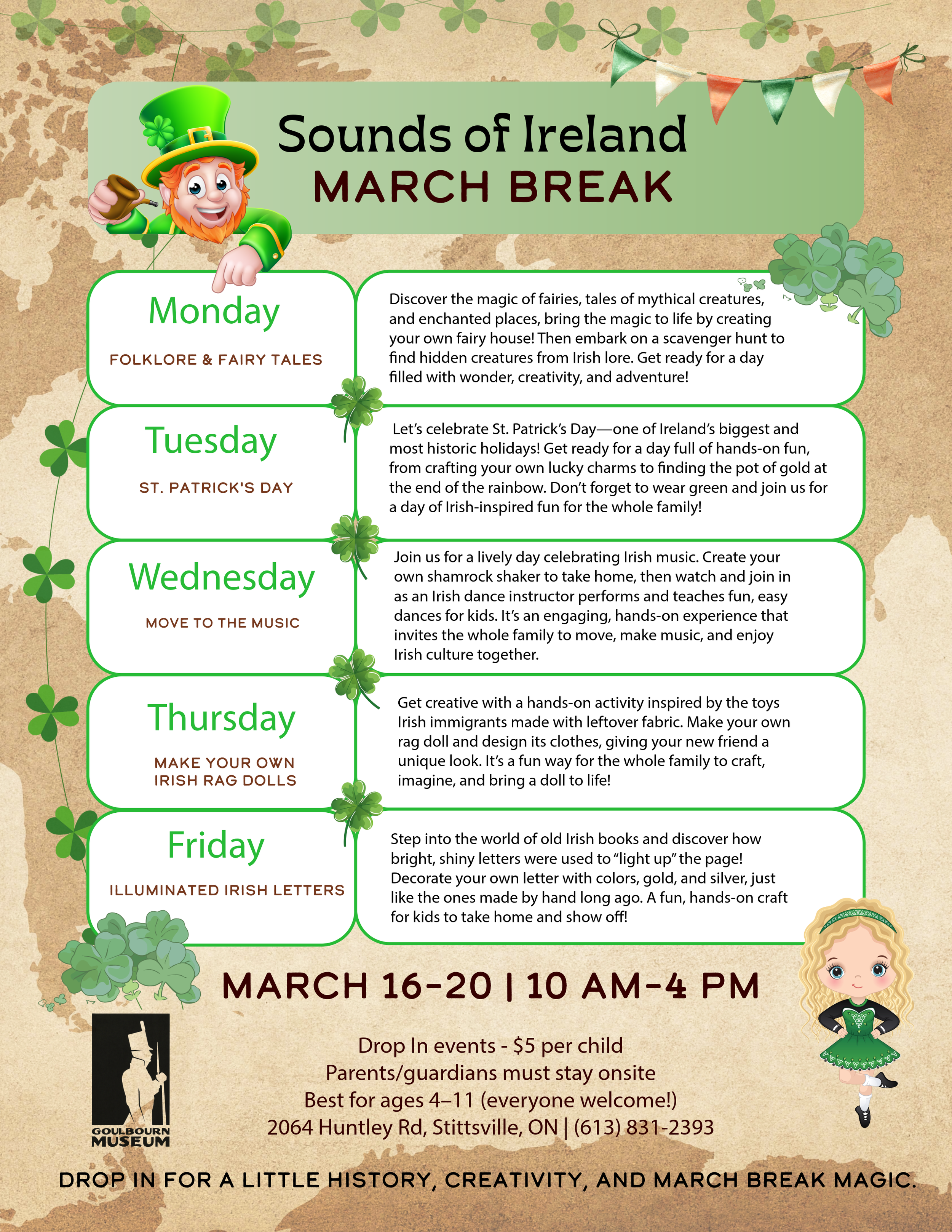 Celebrate the "Sounds of Ireland" this March Break at the Goulbourn Museum! This interactive week-long program invites children to explore Irish culture through a series of hands-on activities, from building fairy houses and hunting for mythical creatures to crafting traditional rag dolls and "illuminated" letters. With daily themes like St. Patrick’s Day celebrations and Irish dance lessons, it is a wonderful way for local families to enjoy history, creativity, and a bit of March Break magic together.