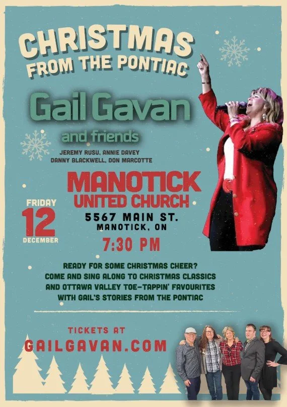 Get ready for some Christmas cheer at the Manotick United Church with "Christmas from the Pontiac," presented by Gail Gavan and Friends. This wonderful concert will be a cozy evening celebrating the holiday season.