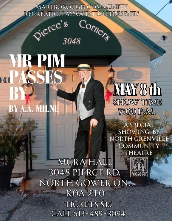 Back to All Events Mr Pim Passes By by A.A. Milne Thursday, May 8, 2025 7:00 p.m. 8:00 p.m. MCRA Hall 3048 Pierce Road North Gower, ON, K0A 2T0 Canada (map) Google Calendar ICS May 8th 2025 at Pierce's Corners Hall we are happy to present Mr. Pim Passes By The North Grenville Community Theatre Group has been working hard. See you Thursday!