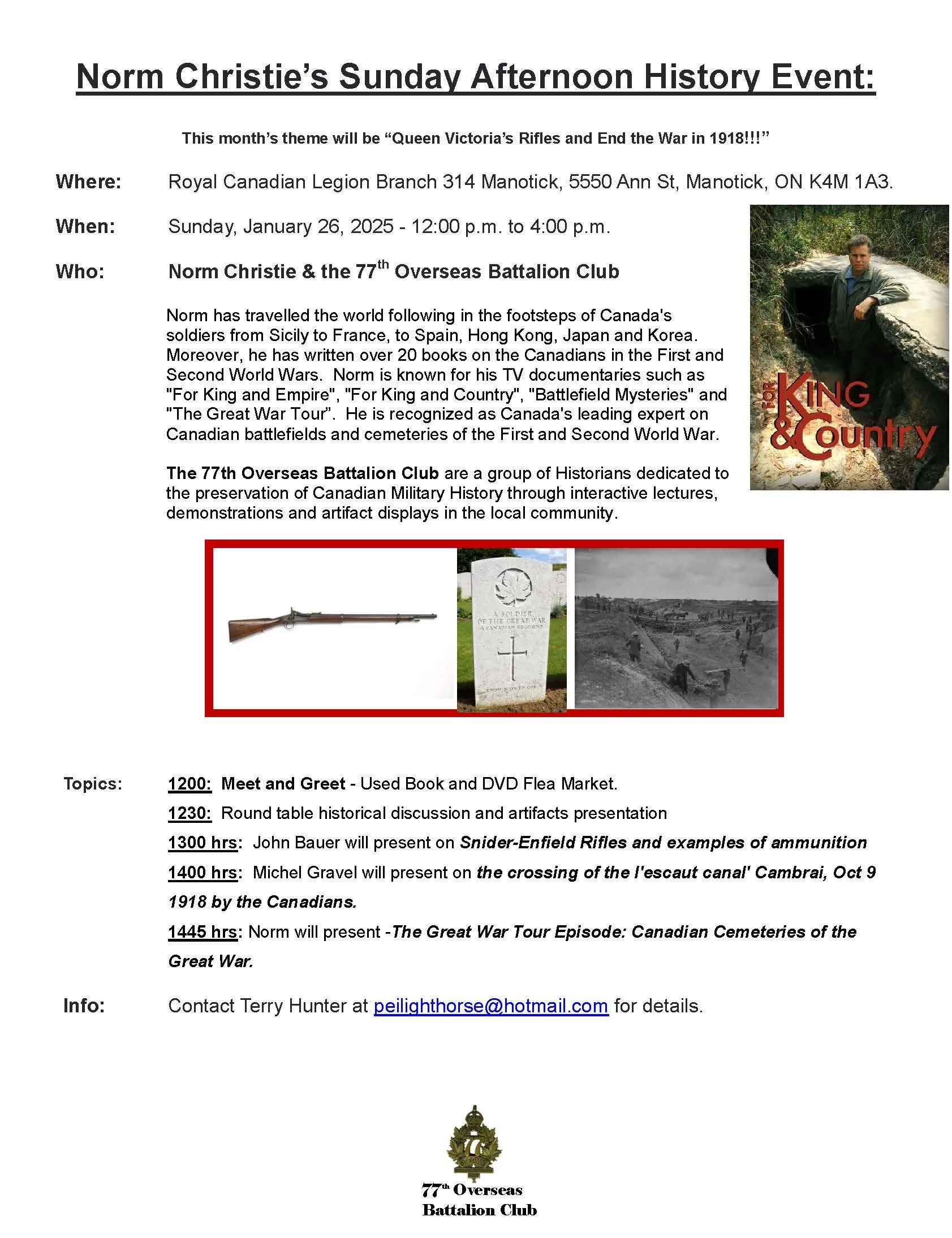 Norm Christie & the 77th Overseas Battalion Club Sunday, January 26, 2025 12:00 p.m. 4:00 p.m. Royal Canadian Legion Branch 314 Manotick 5550 Ann Street Manotick, ON, K4M 1A3 Canada (map) Google Calendar ICS