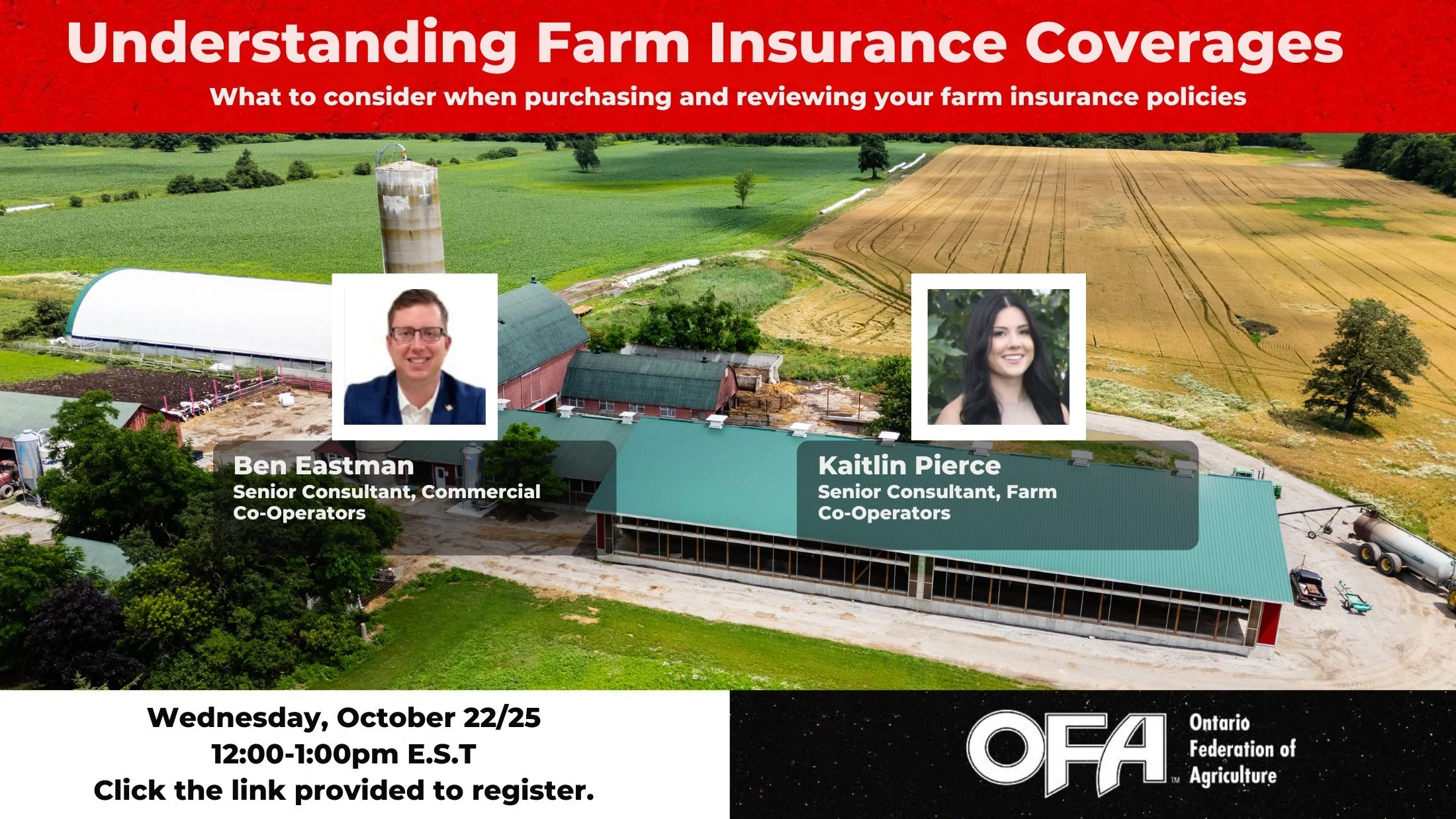 Join the Ontario Federation of Agriculture (OFA) for a "Lunch n' Learn" webinar on farm insurance. This presentation will cover typical coverages for farm structures, what to consider when purchasing or reviewing your policy, optional add-ons, and what is typically not covered.
