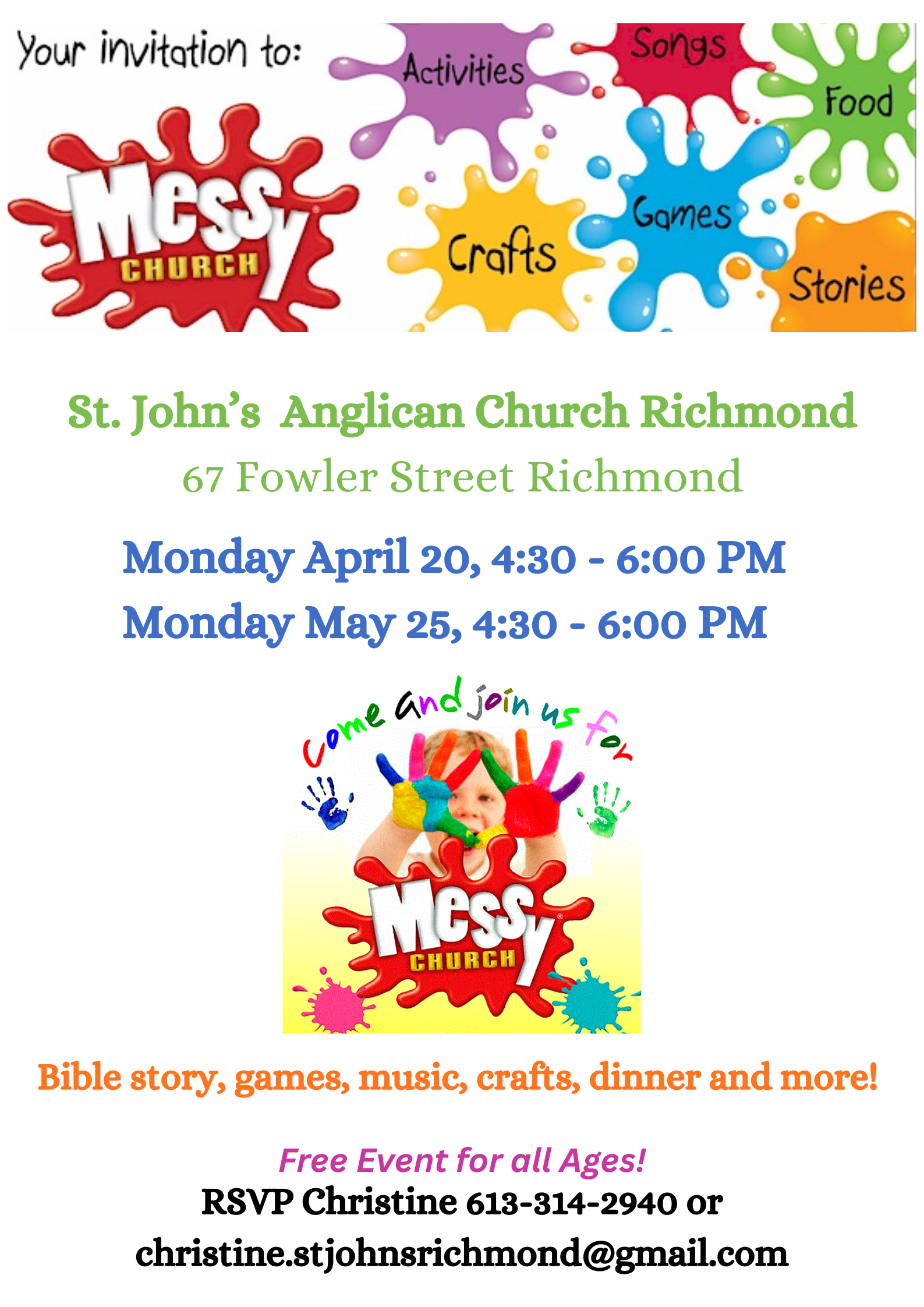 St John's Anglican Church Richmond Messy Church Monday, April 20, 2026 4:30 a.m. Monday, May 25, 2026 6:00 p.m. Google Calendar ICS