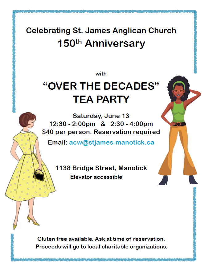 Celebrate 150 years of community history with St. James Anglican Church at their special "Over the Decades" Tea Party. This festive event offers guests a chance to enjoy tea and treats while supporting local charitable organizations. The venue is elevator accessible, and gluten-free options are available upon request when you book your spot.