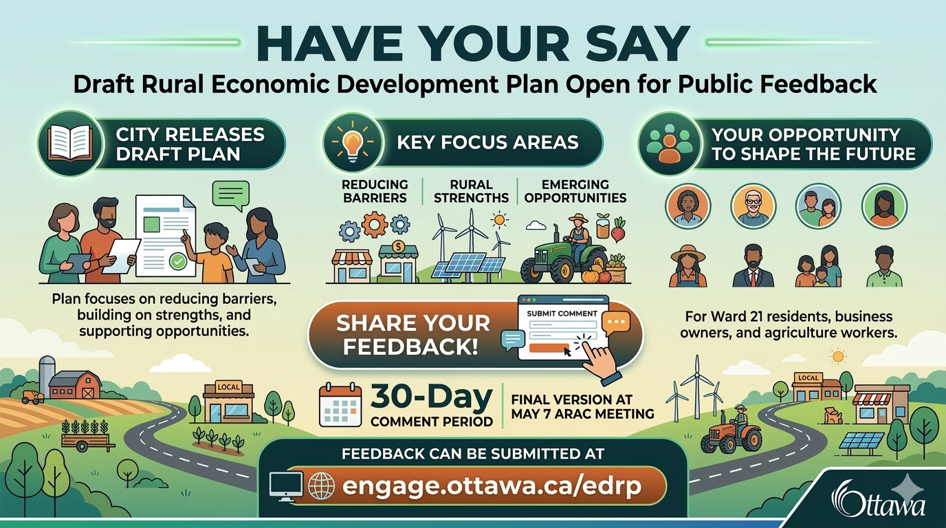 The plan was presented to the Agriculture and Rural Affairs Committee (ARAC) this week and is now posted on Engage Ottawa for a 30-day comment period. It focuses on reducing barriers, building on rural strengths, and supporting emerging economic opportunities across Ottawa's rural communities. A final version will be returned to ARAC for consideration at the May 7 meeting.