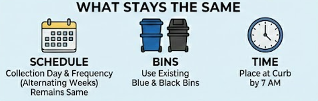 For residents, the curbside routine remains familiar. Your collection day remains the same. Blue and black bins remain separate, and materials should still be at the curb by 7:00 am on collection day. You can continue using your existing bins, and the City collection calendar tools remain available for scheduling. What you may notice is a different truck collecting your recycling, or collection occurring at a different time of day, but your set out routine stays the same.